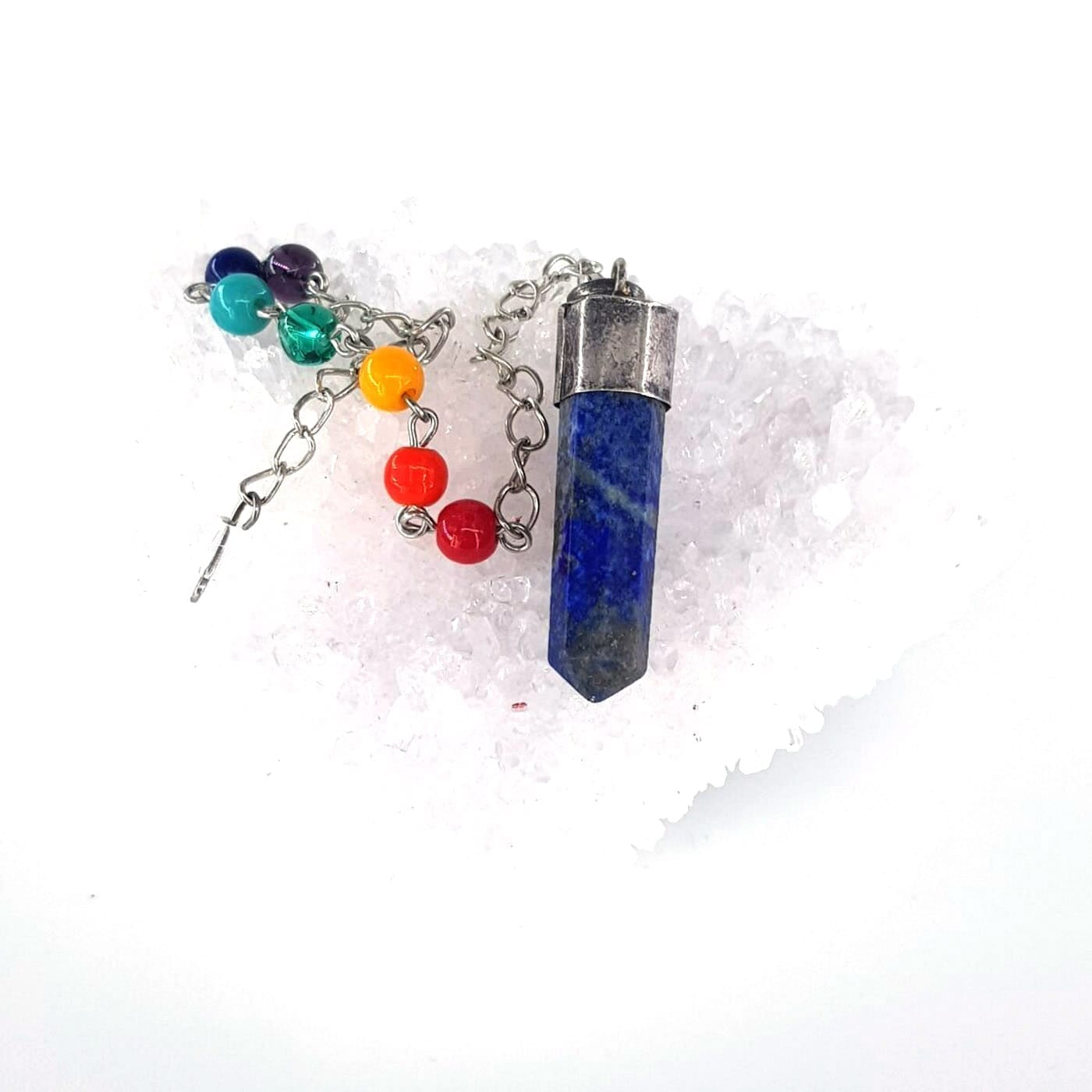 Tipik olarak, 7 çakralı sarkaçlarda Kırmızı Jasper, Carnelian, Sitrin, Yeşil Aventurin, Sodalit / Lapis Lazuli ve Ametist kristalleri bulunur. sarkaç çalışmalarında çoklu çakra şifası ve dengesi için mükemmeldirler.